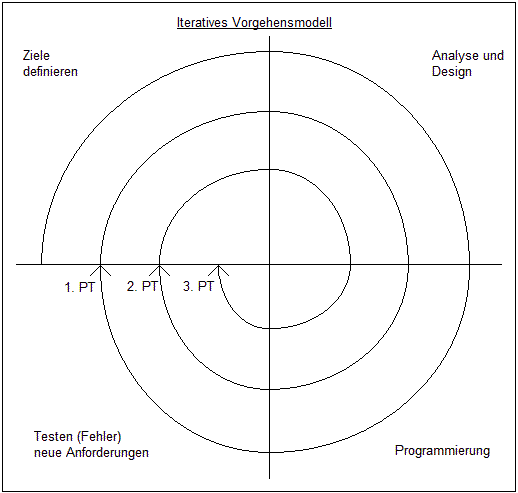 Auch die iterativen Vorgehensmodelle haben verschiedene Bezeichnungen. In der folgenden Grafik sind 3 Prototypen (PT) dargestellt.